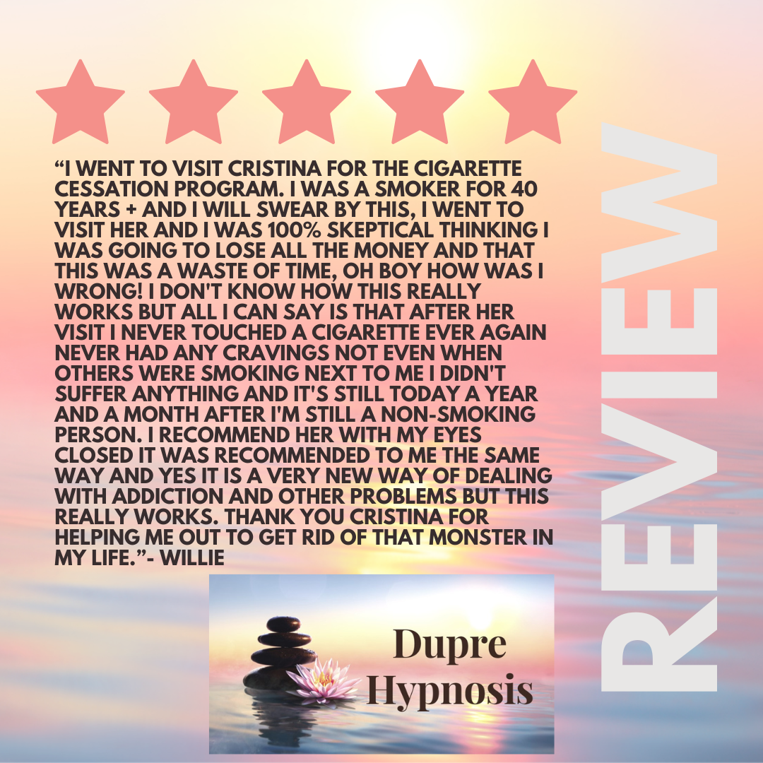 Cristina also provides clinical hypnosis for smoking cessation. Typically, clients experience success after only one session. Others may need up to three sessions. A second appointment is always scheduled for support and to promote strength as the client progresses. During the first 1-hour session, the client is able to understand the total commitment of never smoking again. Cognitive Behavior Theory (CBT) is explained and applied to change the patterns of behavior that lead someone to smoke. Hypnosis helps the client to break the pattern of behavior as well as to let go of the cravings. It breaks the pattern of behavior by developing new behaviors as well as removing the craving or desire to smoke again. At the end of the hypnosis session, a recording of the session is provided so that the client may bring themselves back to a state of trance where cravings and behaviors can be let go. Most clients cancel the second appointment stating that they are doing fine and do not need to come back. Individual sessions are $200 for a 1-hour session. Cristina also provides clinical hypnosis for vaping and chewing tobacco as well.
